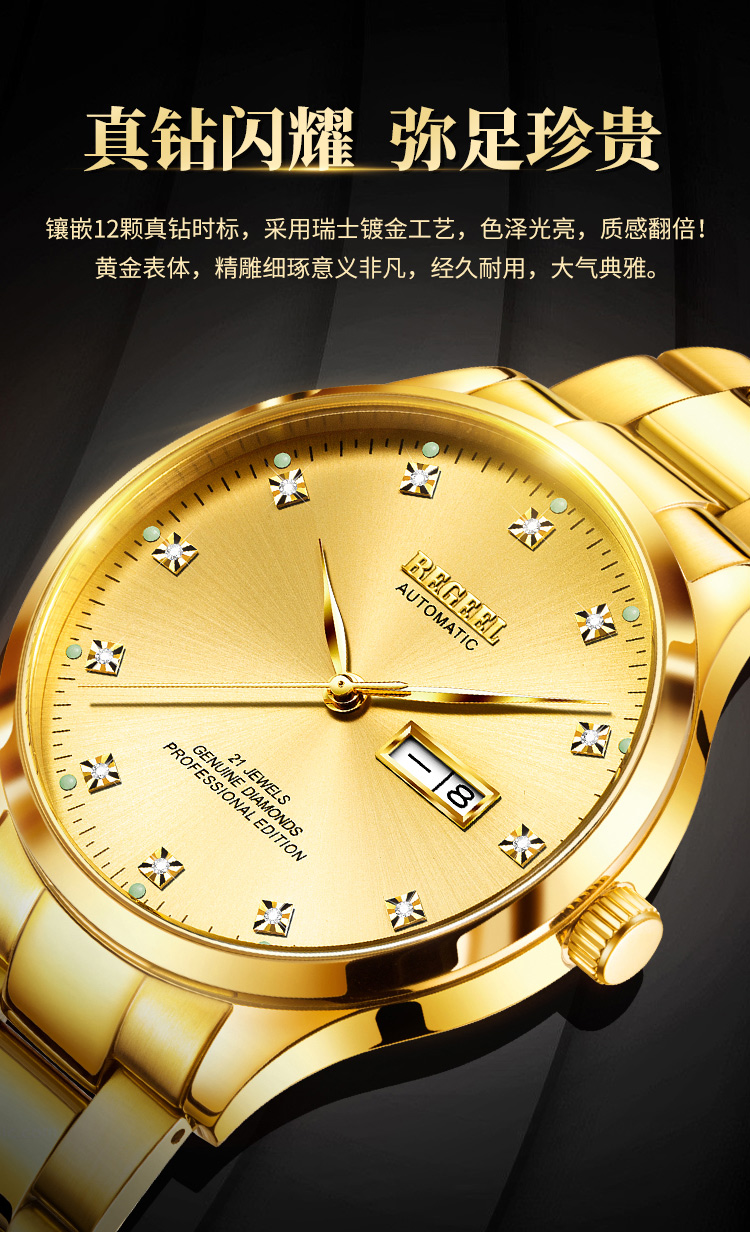 你看看這枚腕表,表殼是傳統(tǒng)式的三針記時(shí)設(shè)計(jì)方案,表殼上有一個(gè)日歷作用,總體看起來(lái)簡(jiǎn)約,表殼薄厚是8毫米,十分薄,翻腕不容易卡襯衣的衣袖,手表表殼表帶是鍍金色不銹鋼,總體看起來(lái)質(zhì)樸而綺麗。