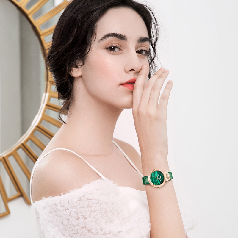 表殼:316L鋼 電鍍玫瑰金 鑲水鉆共108粒 12點(diǎn)位 鑲孔雀石片/珍珠
