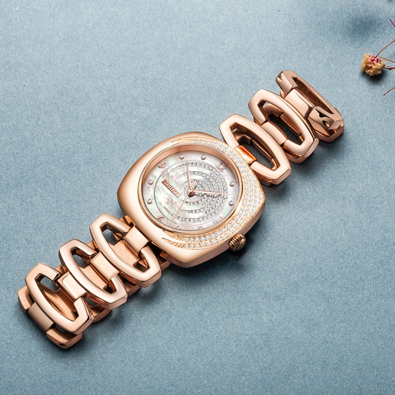 字面:貝殼面,外圈放射紋路,8顆天然真鉆,81顆水鉆,3/6/9/12阿拉伯刻度