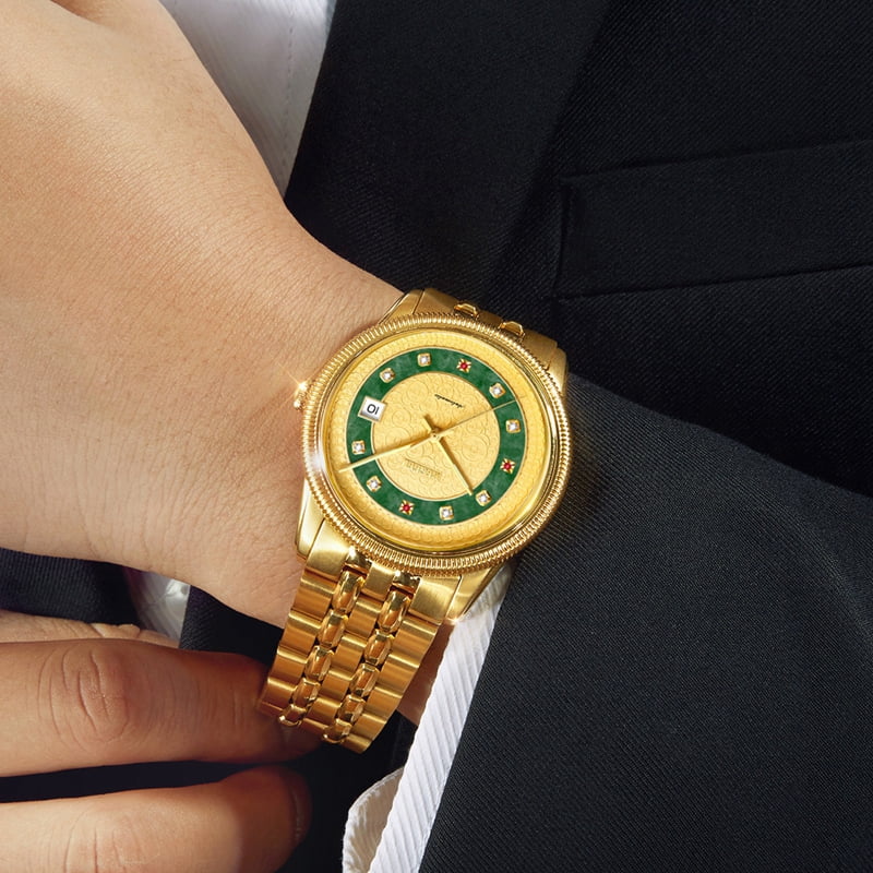 字面:金幣紋+貝殼翡翠紋,鑲8顆真鉆,3顆真紅寶石,指針:超強夜光