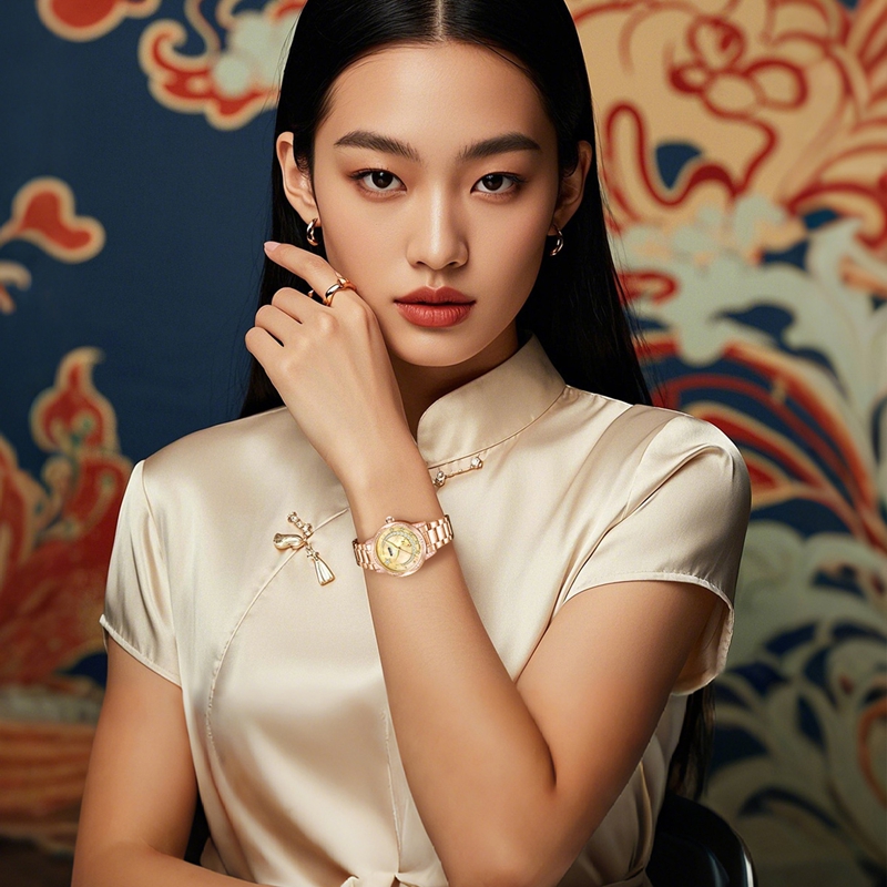字面:金色貝殼面,11點(diǎn)位1顆1.75mm托帕石,兔眼1顆真紅寶石,5顆真鉆石,33顆晶鉆,夜光針