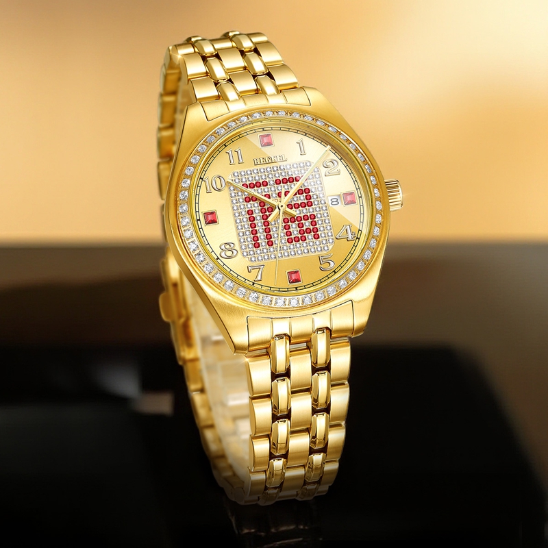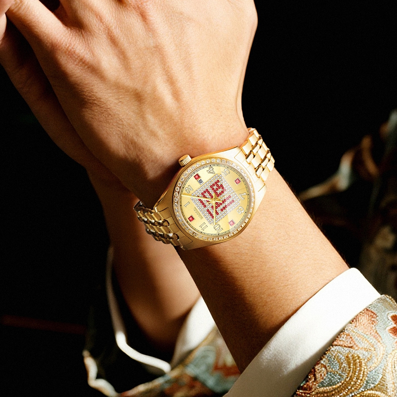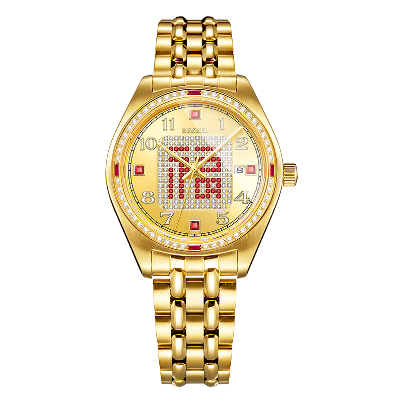 字面:太陽(yáng)紋金面,滿(mǎn)天星紅福字,鑲2顆真紅寶石,52顆合成紅寶石,4顆合成紅寶石方石,132顆晶鉆,夜光阿拉伯?dāng)?shù)字,夜光指針